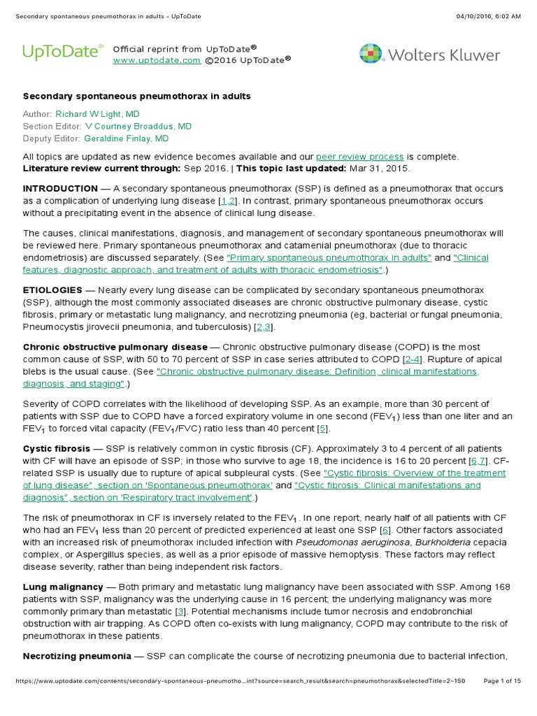 Secondary Spontaneous Pneumothorax In Adults Uptodate Respiratory Diseases Pneumonia